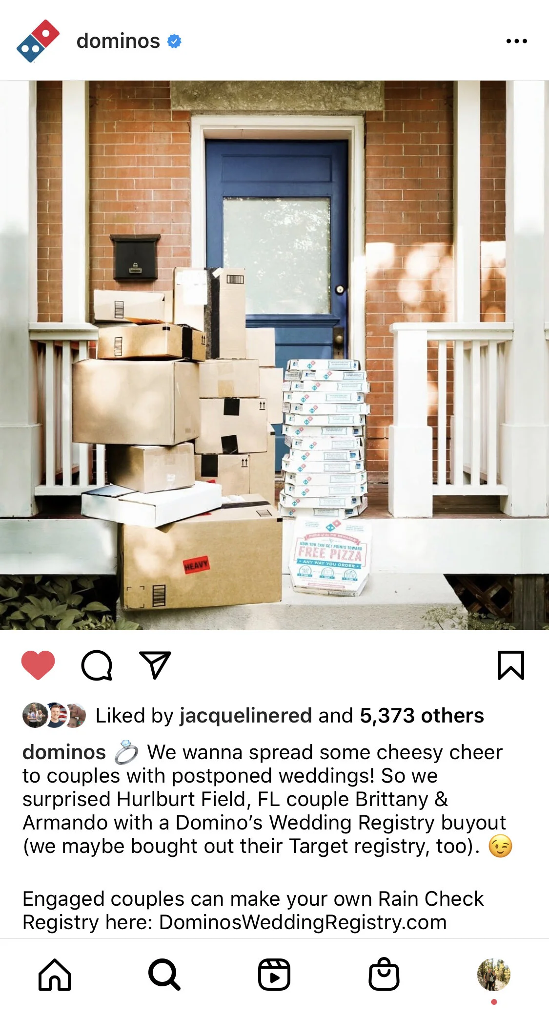 Then, the dumpster fire that was 2020 hit. And 63% of betrotheds had to postpone their nuptials due to COVID-19. So, we included a new Raincheck Registry option. It allowed would-be guests to buy gifts for the couple to ease the wait until their postponement date, with packages for the “Virtual Vendor Call-a-thon,” “Bridal Shower But Make it Virtual,” and of course, “The OG Wedding Date.” We even surprised a few Raincheck registrants by buying them their entire registries. Not just their Domino’s ones. All of them. Fine china included.